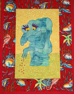 But enough of "poor me". I am now back working - VERY carefully - and have focused on a new drawing exercise as a quilt. In this exercise you paint blobs of watercolor (red, blue and yellow) on a small piece of watercolor paper and, after it is dry, look at the intersections of color and find the shape of an animal. Some of my animals weren't too interesting - but I really like this one. His name is Norman. The quilt should be finished in a day or two. Barbara